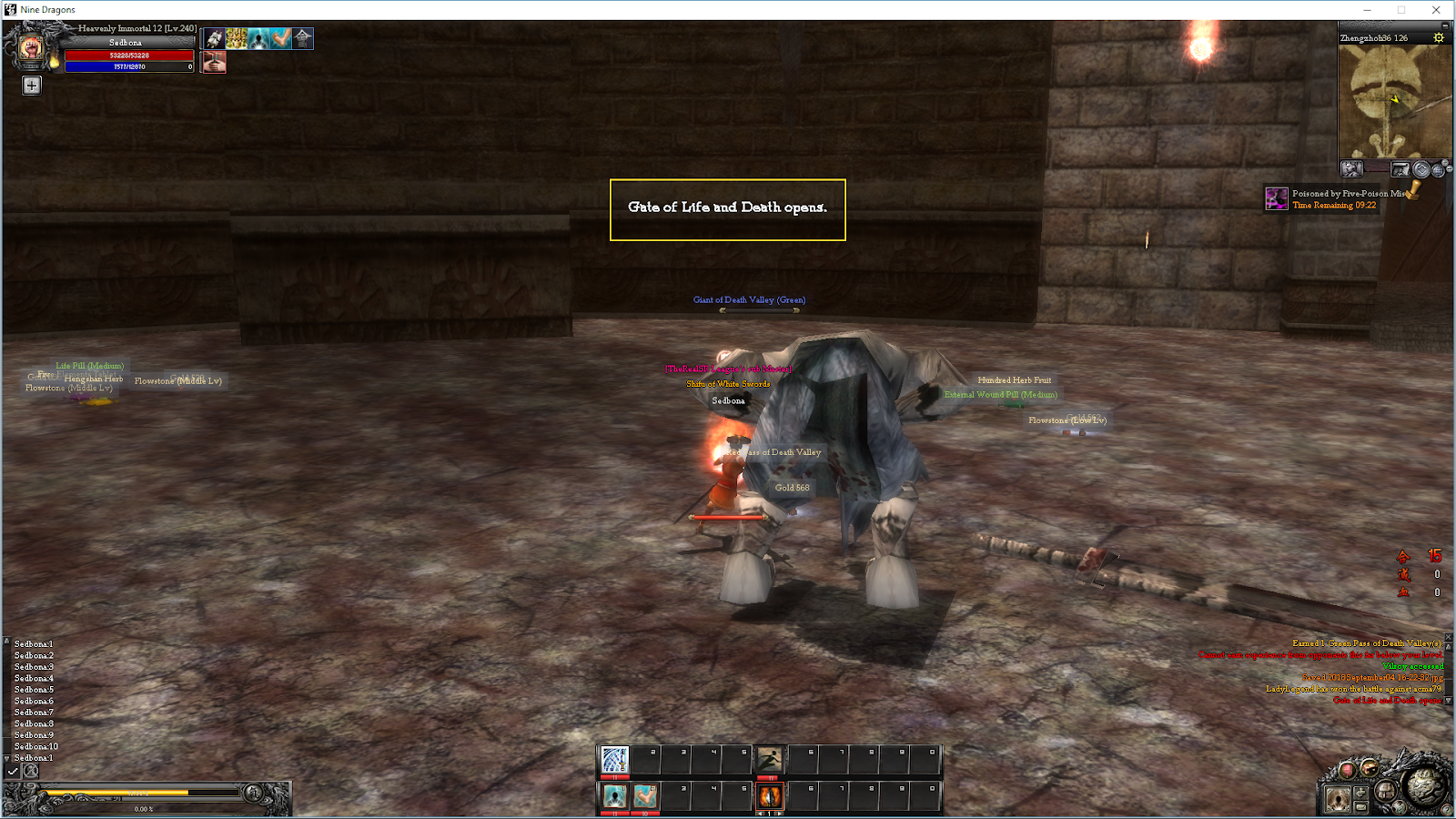 [ Overview & Location] The Choice of Fate is the first dungeoun located in Zhengzhou for White Clans, and in Shi Zhang for Black Clans. Revamp passes: Green (medium) : Monsters level 120 - 140 Red (hard) : Monsters level : level 200 - 210 Costs : New Overview : New monsters have been added, and monster locations have been revamped for all passes. Death Valley Passes can now be purchased at Merchant NPC’s, Luo Tingyi and Zou Chengjin. The amount of experience points gained in Green and Red Dungeons has been increased. The Resource list and Creation List has been updated. Some items are no longer available for trade or craft. The Entrance : The rooms : Entrance + Minirooms with poison stone pillars Room 1 (monsters) Room 2 (monsters + boss) Loot Rooms /3 (Treasure Rooms ) From Entrance to first room you advance by destroying the 4 stone pillars from the minirooms. When you enter the dungeoun you find yourself surrounded by poison so better stay in peace mode till you find the first stone-pillar.