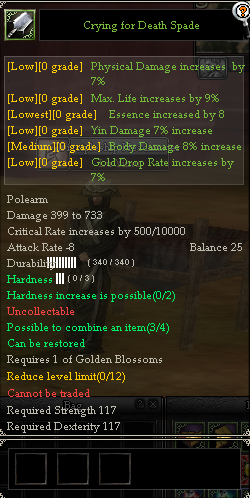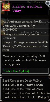 [Possible Loot/Drop] Death Valley New Item Drop List : Advanced Crimson Iron Nugged (Low/Mid) Crying for Death Sword Crying for Death Saber Crying for Death Staff Crying for Death Gloves Crying for Death Dagger Crying for Death Axe Crying for Death Wheels Crying for Death Spear Crying for Death Spade Crying for Death Bracers Flowstone Low Flowstone Mid Flowstone High A Piece of Steel [Level 1-10] Enhancement Stone C11-12 Skill Books Purple Jade of Death Valley Death Bead Death Plate Shard (1) Death Plate Shard (2) Death Plate Shard (3) Death Plate Shard (4) Death Plate Shard (5) Green: (Mobs + Boxes) Red: (Mobs + Boxes)