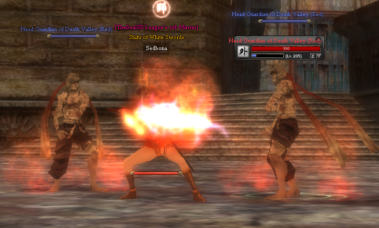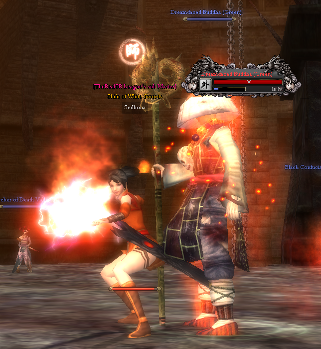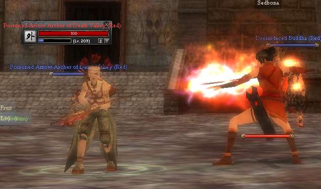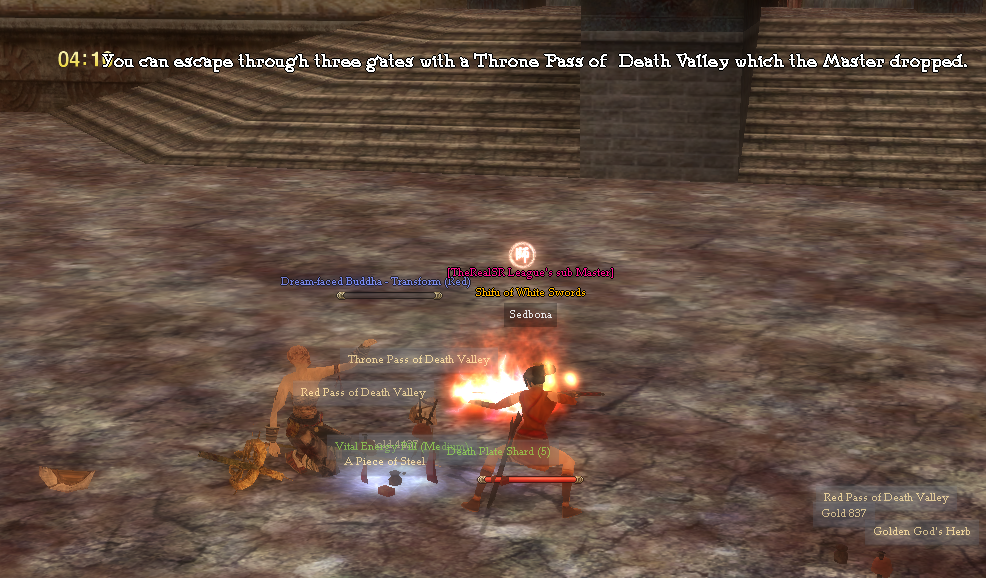 [Dungeon : Red Run] Room 1 : Blue Arrow Archer of Death Valley (Red) - level 200 Earthworm Demon of Death Valley (Red) - 201 Giant of Death Valley (Red) - level 203 Giant of Death Valley (Red) - MiniBoss - level 209 After you kill the Giant the gate to second room will open. You can kill only the Giant to advance to the second room. Head Guardian of Death Valley (Red) - level 205 Iron Flower of Death Valley (Red)- level 206 Black Confucianist of Death Valley (Red)-level 207 Blood-Scythe Monk of Death Valley (Red)- level 208 The boss will spawn with other mobs around him : Poisoned Arrow Archer of Death Valley (Red) - level 209 The Boss has two forms : Dream-faced Buddha (Red) -level 210 Dream-faced Buddha - Transform (Red)- level 210 Loot rooms/ Treasure Rooms (3). From the loot rooms where you can find chests with different type of loot objects, you break the wall and exit to the village.